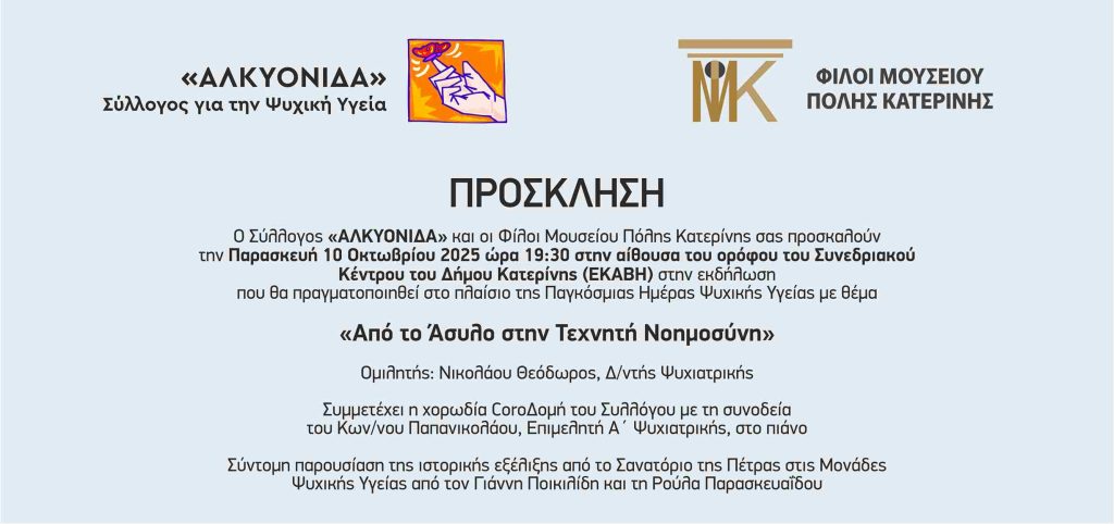 GIANNIS ΝΕΑ - ΑΝΑΚΟΙΝΩΣΕΙΣ, ΣΥΜΜΕΤΟΧΕΣ ΣΕ ΔΗΜΟΣΙΕΣ ΕΚΔΗΛΩΣΕΙΣ 27 Νοέ 2025 27/11/2025 Με την “Αλκυονίδα” για την Παγκόσμια Ημέρα Ψυχικής Υγείας – 10.10.2025 Μετά από πρόταση του Συλλόγου για την Ψυχική Υγεία «ΑΛΚΥΟΝΙΔΑ», συμμετείχαμε στην εκδήλωση με θέμα «Από το Άσυλο στην Τεχνητή Νοημοσύν... Συνέχεια ανάγνωσης